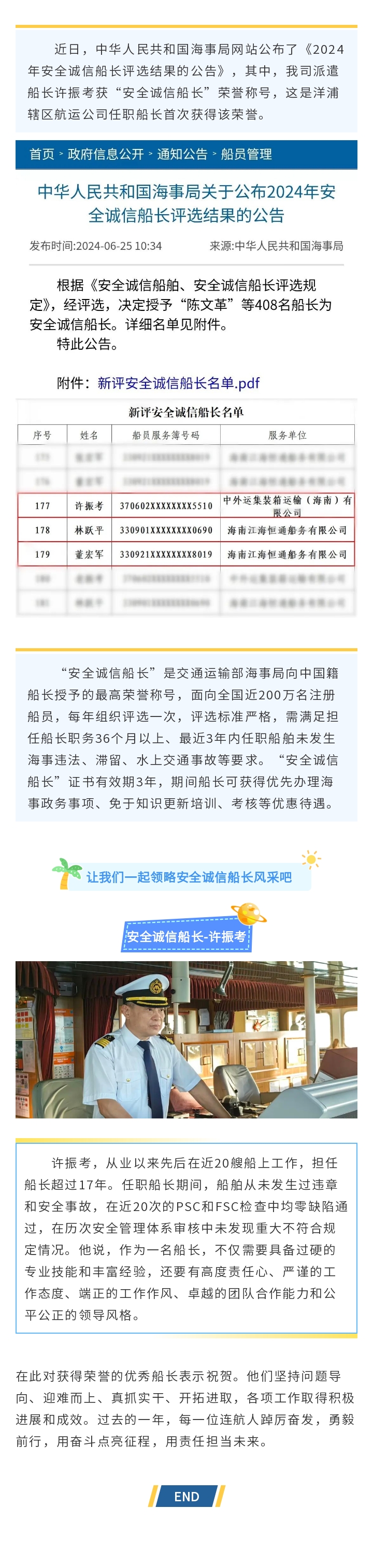 喜報!青島連航派遣船長榮獲全國“安全誠信船長”稱號