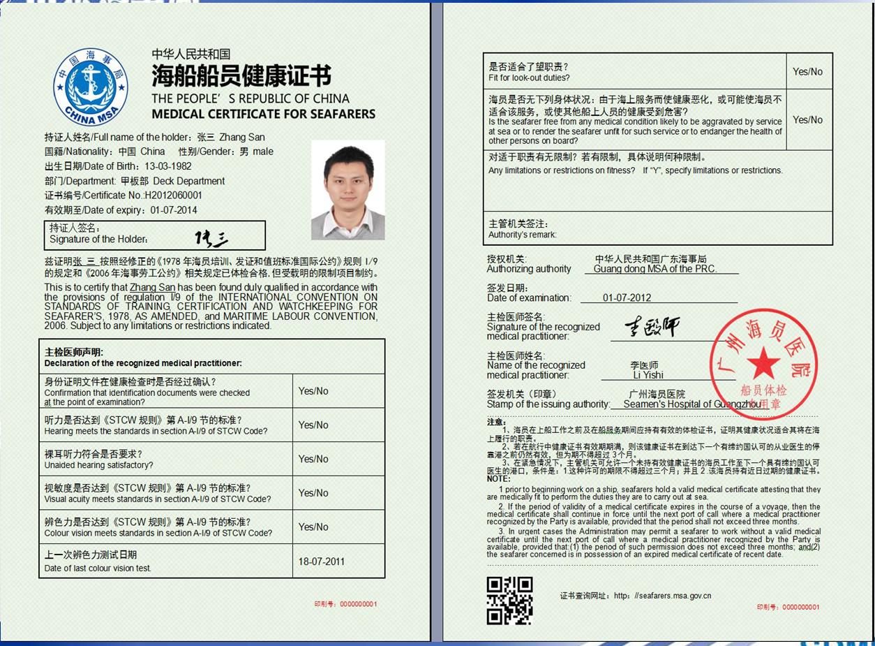 中華人民共和國海船船員健康證書